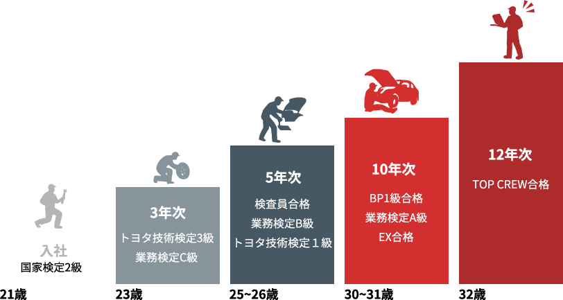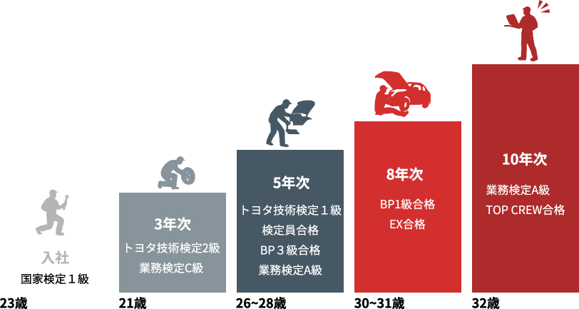 トヨタ独自のサービスエンジニア向け資格制度。基礎から総合的な故障診断・整備技術を段階的に習得・証明するもので、給与やキャリアアップに反映されます。